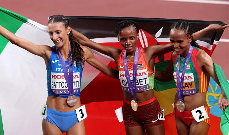 Ethiopia’s defending champion Gudaf Tsegay won her fifth world championships medal, completing the podium in 30:39.65.