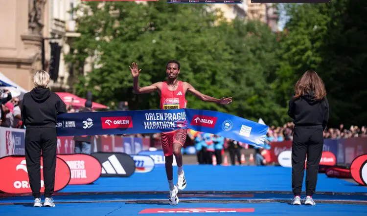 Lemi Berhanu Hayle broke away from his leading group about two-thirds into the race and crossed the finish in 2:05:14, the second-fastest time in Prague Marathon history — just five seconds shy of the course record.