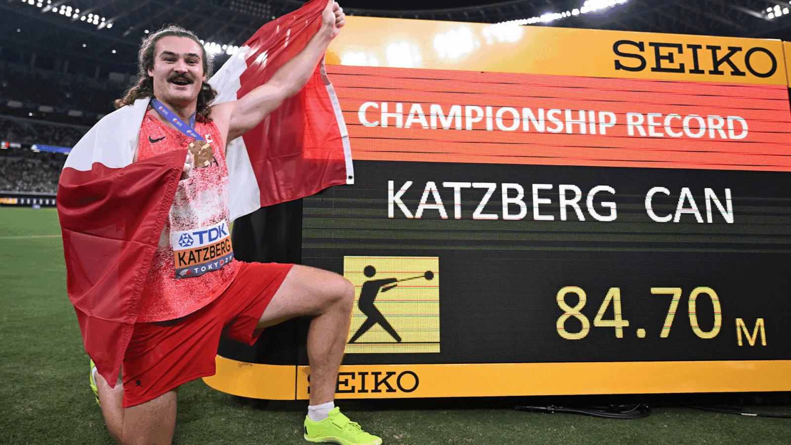 Ethan Katzberg successfully defended his world hammer throw title in Tokyo with a dominant series of throws, highlighted by a championship record and personal best of 84.70m.