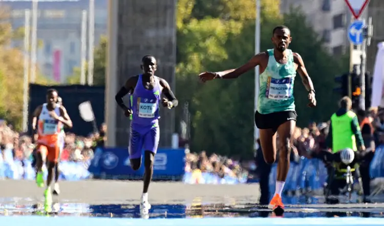 On Berlin’s famously fast course, the men cruised through 5km in 14:25 and 10km in 28:42 before passing halfway in 60:57. There were still nine men in the lead group at 35km and these included Kibiwott Kandie, the former world half-marathon record-holder, although he was soon among those to get dropped, eventually finishing 13th. Similarly, Tadese Takele, another pre-race favourite, faded to seventh in the latter stages in 2:05:13 as Mengesha up ahead went from strength to strength.
