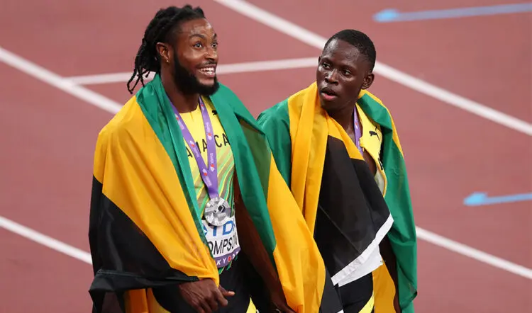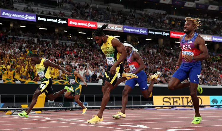 Jamaicans dominate sprint showpiece as Kishane Thompson wins silver and Noah Lyles takes bronze at World Championships.