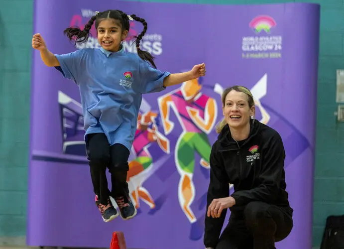 The Kids’ Athletics day took place at Haghill Primary School, only a stone’s throw away from Glasgow’s Emirates Arena where world champions will be crowned. The day offered local children the chance to immerse themselves in the sport, participating in a series of adapted athletics events to develop core skills, including the standing long jump, speed bounds, seated ball throw and group relay challenges.