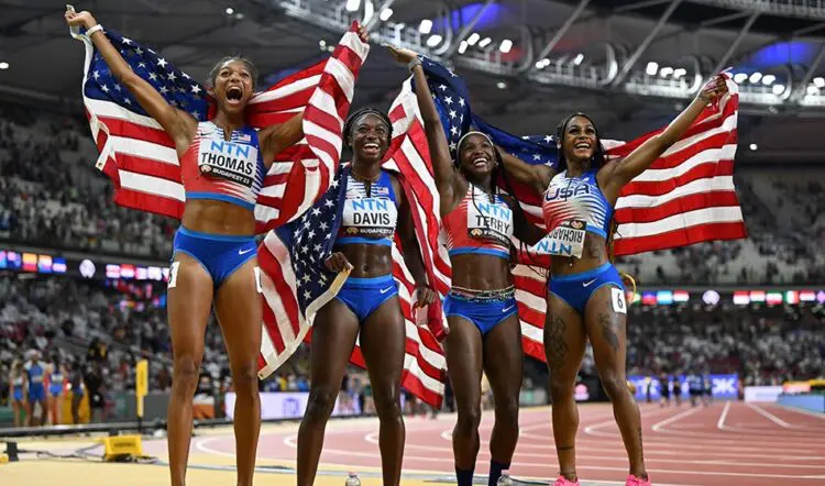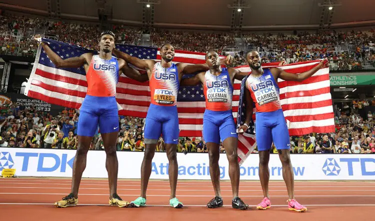 4x100: Final (26th): 1 USA 41.03; 2 JAM 41.21; 3 GBR 41.97; 4 ITA 42.49; 5 POL 42.66; 6 GER 42.98; NED DNF; CIV DNF; SUI DQ. Heat 1 (25th): 1 JAM 41.70; 2 GBR 42.33; 3 SUI 42.64; 4 GER 42.78; 5 TTO 42.85; 6 ESP 42.96; 7 FRA 43.12; AUS DNF. Heat 2 (25th): 1 USA 41.59; 2 CIV 41.90 AR; 3 ITA 42.14 NR; 4 NED 42.53; 5 POL 42.65; 6 CUB 43.17; 7 43.38 NR; 8 BRA 43.46; NGR DNF
