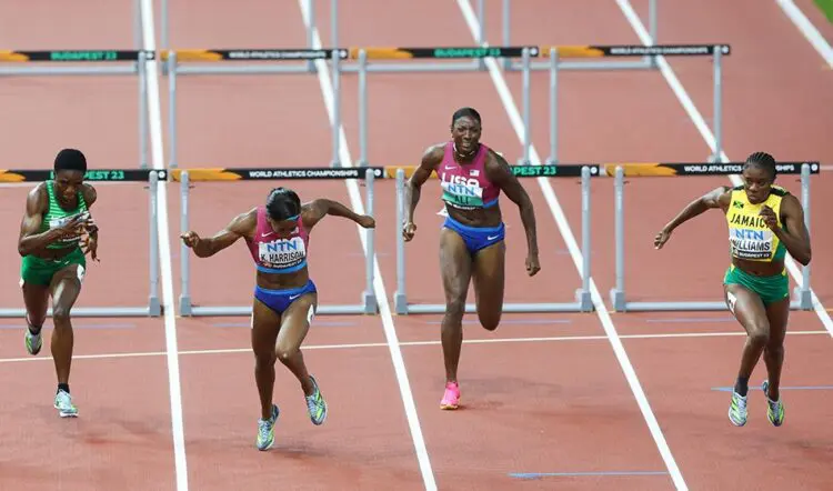 100H (24th; -0.2): 1 Danielle Williams JAM 12.43; 2 Jasmine Camacho-Quinn PUR 12.44; 3 Kendra Harrison USA 12.46; 4 Devynne Charlton BAH 12.52; 5 Ackera Nugent JAM 12.61; 6 Tobi Amusan NGR 12.62; 7 Ditaji Kambundji SUI 12.70; 8 Nia Ali USA 12.78. SF1 (23rd; 0.5): 1 Kendra Harrison USA 12.33; 2 Devynne Charlton BAH 12.49; 3 Ditaji Kambundji SUI 12.50; 4 Megan Tapper JAM 12.55; 5 Sarah Lavin IRL 12.62 NR; 6 Cindy Sember GBR 12.97; 7 Maayke Tjin A-Lim NED 13.05; 8 Natalia Christofi CYP 13.15. SF2 (23rd; -0.7): 1 Tobi Amusan NGR 12.56; 2 Ackera Nugent JAM 12.60; 3 Nadine Visser NED 12.62; 4 Luca Kozák 12.73; 5 Cyrena Samba-Mayela FRA 12.95; 6 Celeste Mucci AUS 12.97; 7 Reetta Hurske FIN 13.05; Masai Russell USA DNF. SF3 (23rd; -0.4): 1 Jasmine Camacho-Quinn PUR 12.41; 2 Nia Ali USA 12.49; 3 Danielle Williams JAM 12.50; 4 Pia Skrzyszowska POL 12.71; 5 Michelle Jenneke AUS 12.80; 6 Marione Fourie RSA 12.89; 7 Mette Graversgaard DEN 12.94; 8 Michelle Harrison CAN 13.05. Heat 1 (22nd; 0.1): 1 Ackera Nugent JAM 12.60; 2 Masai Russell USA 12.60; 3 Sarah Lavin IRL 12.69; 4 Cyrena Samba-Mayela FRA 12.71; 5 Mette Graversgaard DEN 12.87; 6 Michelle Harrison CAN 12.88; 7 Gréta Kerekes 13.09; 8 Masumi Aoki JPN 13.26; Heat 2 (22nd; 0.1): 1 Nia Ali USA 12.55; 2 Pia Skrzyszowska POL 12.65; 3 Marione Fourie RSA 12.71; 3 Luca Kozák 12.71; 5 Lotta Harala FIN 13.11; 6 Asuka Terada JPN 13.15; 7 Sidonie Fiadanantsoa MAD 13.18; 8 Viktória Forster SVK 13.47; 9 Caroline Tomaz BRA 13.59; Heat 3 (22nd; 0.1): 1 Kendra Harrison USA 12.24; 2 Devynne Charlton BAH 12.44 NR; 3 Danielle Williams JAM 12.51; 4 Cindy Sember GBR 12.83; 5 Reetta Hurske FIN 12.92; 6 Anna Tóth 12.95; 7 Taylon Bieldt RSA 13.05; 8 Hannah Jones AUS 13.05; 9 Dina Aulia INA 13.54; Heat 4 (22nd; 0.0): 1 Jasmine Camacho-Quinn PUR 12.50; 2 Nadine Visser NED 12.68; 3 Ditaji Kambundji SUI 12.71; 4 Celeste Mucci AUS 12.90; 5 Laeticia Bapte FRA 12.93; 6 Mariam Abdul-Rashid CAN 13.04; 7 Jyothi Yarraji IND 13.05; 8 Klaudia Siciarz POL 13.25; 9 Naomi Akakpo TOG 13.96; Heat 5 (22nd; 0.4): 1 Tobi Amusan NGR 12.48; 2 Megan Tapper JAM 12.51; 3 Michelle Jenneke AUS 12.71; 4 Natalia Christofi CYP 12.90; 5 Maayke Tjin A-Lim NED 12.92; 6 Ebony Morrison LBR 12.93; 7 Yumi Tanaka JPN 13.12; 8 Nika Glojnarič SLO 13.13