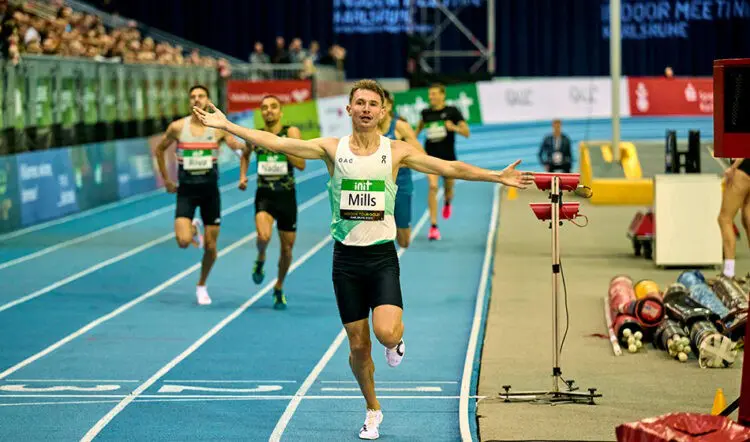 On a fine night for British athletes, George Mills opened his season with a runaway win in the 1500m in Karlsruhe as he clocked an indoor PB of 3:35.88.