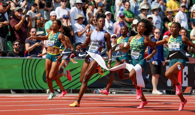 Shericka Jackson of Jamaica took the women’s 100m in 10.70 (0.8) from Marie-Josee Ta Lou of the Ivory Coast with 10.75, Elaine Thompson Herah of Jamaica with 10.79 and world champion Sha’Carri Richardson of the United States in fourth in 10.80.