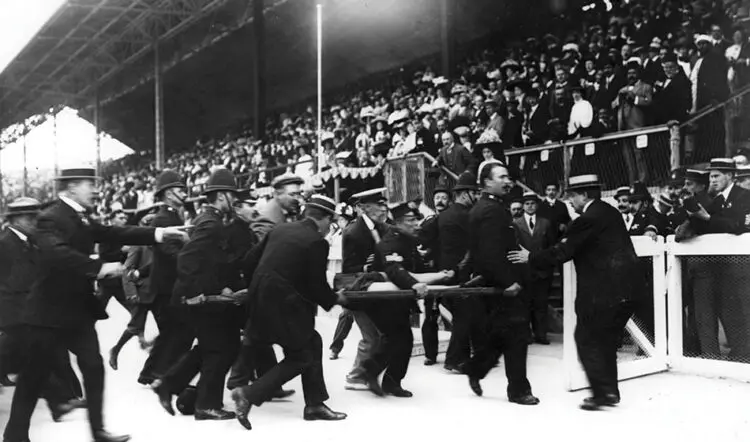 Helped to his feet, Pietri tottered along the rest of the long straight, “the little red legs going incoherently, driven by a supreme will within,” wrote Doyle. As he reached the curve, legs sagging, the crowd groaned in pity and terror as he fell again. Again, they thought he was dying. But again, after much attention, he was up. He covered only a few yards before crumpling yet again at the top of the bend.