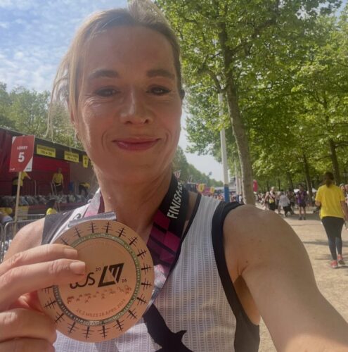 She said: “The gun went at 9:35am for our Championship start and it took me about 20 seconds to cross the line, so the discrepancy between gun and chip should only be 20 seconds or so, I hope.”