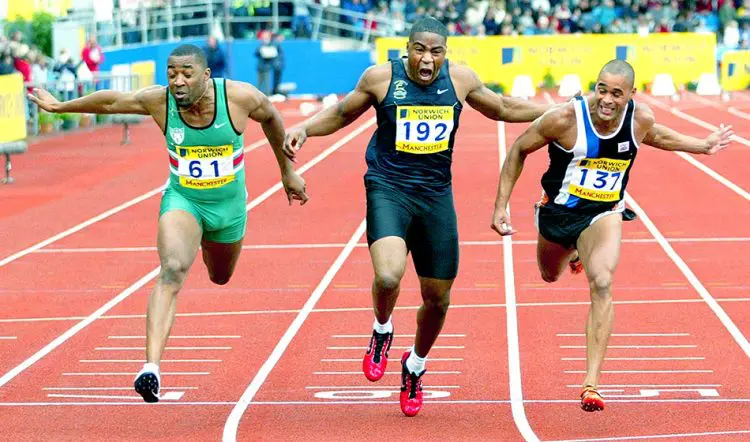 Action from Manchester in 2004, as Jason Gardener wins the 100m in 10.22 ahead of Darren Campbell and Mark Lewis-Francis.
