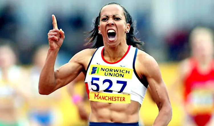 Kelly Holmes celebrates 800m victory (1:59.39) in Manchester in 2004, the month before her Olympic 800m and 1500m double in Athens.