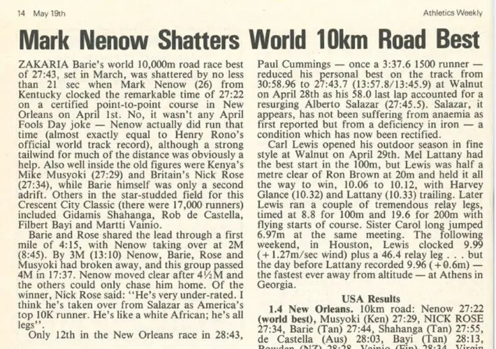 Spare a thought for Nick Rose, though, who ran 27:34 at the Crescent City Classic in 1984. Held on a point-to-point course in New Orleans, Rose’s mark has not been recognised as the British record. The winner that day, however, Mark Nenow, saw his 27:22 celebrated as a world best at the time and it remained in the World Athletics all-time rankings for years before finally having an asterisk put next to it to indicate it is ‘unratified’.