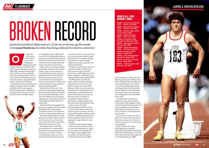 “It’s a definitely a record a lot of people have suspected,” said British record-holder Keely Hodgkinson when asked about Kratochvílová recently. “It’s a very remarkable record. Whether it will be broken in my lifetime, I don’t know. I’m still two-and-a-half seconds away from that.