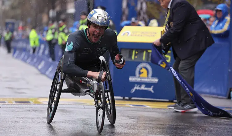 Marcel Hug was also in mild disbelief as he won the men's wheelchair title for the sixth time in Boston by a whopping 10 minutes in a course record of 77:06.