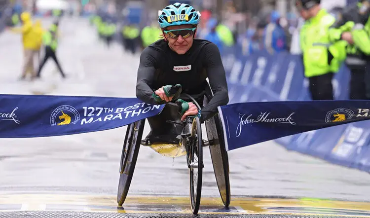 Susannah Scaroni won the women's wheelchair race despite an unplanned mid-race pitstop. "It was pretty emotional," she said. "It was the noisiest I'd ever heard today crossing the line."