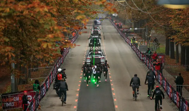 Not only was everything geared around helping Kipchoge get through the miles as comfortably as possible but the entire exercise was aesthetically pleasing with a lead car shining a green laser light on to the ground just in front of the pacers. Ahead of this, meanwhile, the local Polizei had some vehicles to make sure the road was clear.