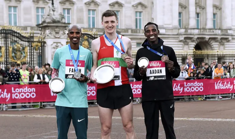 Behind, both men beat a good line-up that included five men who have been selected to run the marathon at various major championships this summer. Mo Aadan was four seconds behind Farah in third in 28:48, then Chris Thompson fourth in 29:10 (breaking Mick McLeod's British M40 record of 29:13 from 1992), Phil Sesemann fifth in 29:19, Hugo Milner sixth in 29:20 and Andrew Heyes in seventh in 29:26.