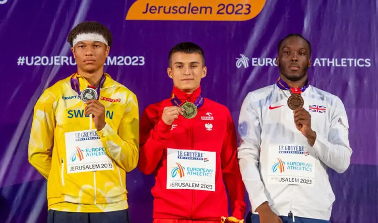 A few minutes after the women's 100m, there was another British sprint medal with Sean Anyaogu taking men's 100m bronze in 10.34 (0.6) behind Isak Hughes of Sweden and Marek Zakrzewski, who ran a Polish junior record of 10.25 to win.