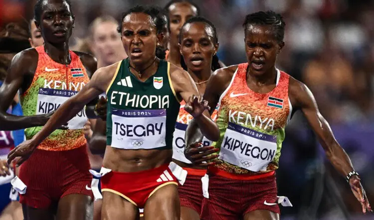 Kipyegon went into the lead with just over three laps remaining and then with 850m to go the clash occurred. It certainly did not help Tsegay, though, as the Ethiopian began grimacing soon afterwards and imploded with 500m to go and began to go backwards as Kipyegon went into the lead again with Chebet chasing her.