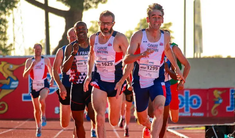 The M35 race was a repeat of the 1500m with Tom Disveld of Netherlands kicking away to win in 1:55.67 with Mike Cummings battling to another silver in 3:57.25.