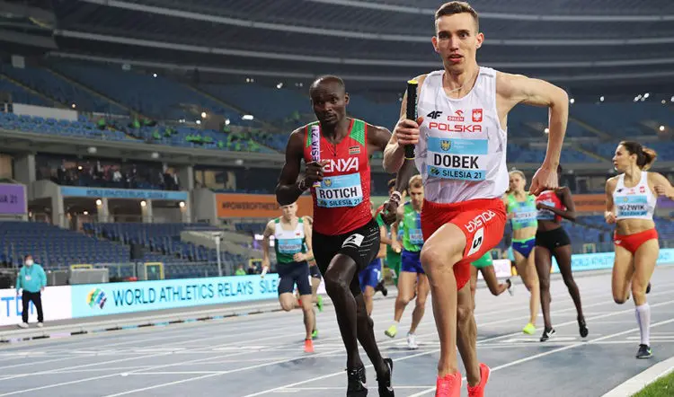 On a day dominated by 4x100m and 4x400m heats, Poland won the 2x2x400m courtesy of 800m runner Joanna Jozwik and 400m hurdler-turned-800m runner Patryk Dobek (below) as they clocked 3:40.92 to beat Kenya and Slovenia. Each team had two runners who tackled alternate 400m legs and it was a largely tactical affair with runners not committing themselves too much in their first one-lap effort.