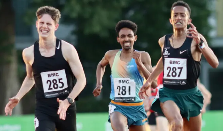 He demonstrated this to full affect to catch Tiarnan Crorken virtually on the line to win the men’s A 1500m in a season’s best of 3:41.80 with a stunned Crorken six hundredths of a second behind.