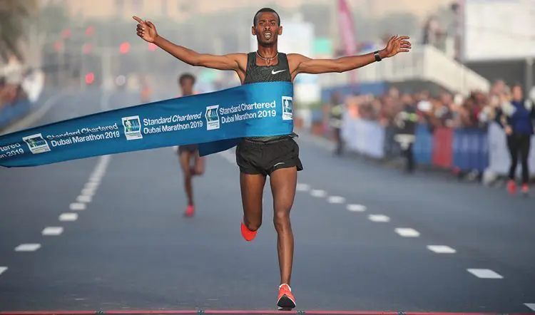 Ethiopia’s Guye Adola had been the holder of the previous fastest ever marathon debut thanks to his 2:03:46 from Berlin in 2017 and he was also racing in Dubai, but dropped out mid-race.