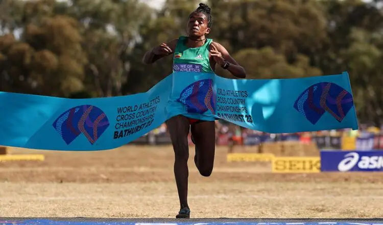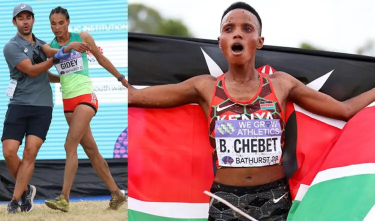 4 Grace Loibach KEN 34:13; 5 Fotyen Tesfay ETH 34:30; 6 Hawi Feysa ETH 34:36; 7 Prisca Chesang UGA 34:42; 8 Edina Jebitok KEN 34:45; 9 Emily Chebet KEN 34:49; 10 Stella Chesang UGA 34:58; 11 Doreen Chesang UGA 35:01; 12 Gete Alemayehu ETH 35:04; 13 Annet Chalangat UGA 35:08; 14 Nozomi Tanaka JPN 35:08; 15 Wede Kefale ETH 35:14; 16 Risper Cherop UGA 35:30; 17 Dolshi Tesfu ERI 35:32; 18 Ednah Kurgat USA 35:36; 19 Ellie Pashley 35:38; 20 Parul Chaudhary IND 35:39; 21 Weini Kelati USA 35:48; 22 Leanne Pompeani 35:49; 23 Rose Davies 35:52; 24 Abbie Donnelly GBR 35:53; 25 Amelia Quirk GBR 35:56; 26 Laura Galván MEX 36:01; 27 Cian Oldknow RSA 36:02; 28 Caitlin Adams 36:03; 29 Isobel Batt-Doyle 36:17; 30 Irene Sánchez-Escribano ESP 36:20; 31 Katie Izzo USA 36:25; 32 Mercyline Chelangat UGA 36:30; 33 Allie Buchalski USA 36:37; 34 Regan Yee CAN 36:43; 35 Natalia Hawthorn CAN 36:43; 36 Poppy Tank GBR 36:47; 37 Kyla Jacobs RSA 36:49; 38 Aynslee van Graan RSA 36:59; 39 Laura Luengo ESP 36:59; 40 Julie-Anne Staehli CAN 37:03; 41 Cristina Ruiz ESP 37:04; 42 Glenrose Xaba RSA 37:08; 43 Katelyn Ayers CAN 37:09; 44 Georgia Hansen 37:15; 45 Naima Ait Alibou ESP 37:17; 46 Maria Bernard CAN 37:23; 47 Sanjivani Jadhav IND 37:30; 48 Kesa Molotsane RSA 37:37; 49 Sarah Drought NZL 37:53; 50 Carolina Robles ESP 38:10; 51 Kate Vaughan CAN 38:20; 52 Megan Keith GBR 38:32; 53 Reimi Yoshimura JPN 38:34; 54 Emily Roughan NZL 38:57; 55 Chavi Yadav IND 39:00; 56 Emily Lipari USA 39:06; 57 Rahel Daniel ERI 39:22; 58 Farhat Bano PAK 39:23; 59 Cacisile Sosibo RSA 39:25; 60 Laura Maasik EST 39:33; 61 Hannah Miller NZL 39:45; 62 Momoka Kawaguchi JPN 39:50; 63 Zhou Xia CHN 39:50; 64 Lisa Cross NZL 40:02; 65 Olivia Mugove ZIM 40:06; 66 Mary Tenge PNG 40:30; 67 Kerry White NZL 40:54; 68 Yao Miao CHN 41:20; 69 Katherine Camp NZL 41:45; 70 Li Yingcui CHN 41:48; 71 Laura Cusaria COL 42:08; 72 Ongan Awa PNG 42:30; 73 Dianah Matekali SOL 42:51; 74 Joan Makary LBN 43:12; 75 Jennifer Tomazou LBN 43:35; 76 María Pía Fernández URU 43:53; 77 Scholastica Herman PNG 44:02; 78 Sharon Firisua SOL 44:06; 79 Lauriane Bisch PYF 44:08; 80 Ramata Abdulai GHA 44:23; 81 Vanessa Lee Ying Zhuang SGP 44:41; 82 Nathania Tan NMI 44:51; 83 Nesrine Njeim LBN 45:17; 84 Tiana Abdel Masih LBN 45:27; Letesenbet Gidey ETH DQ