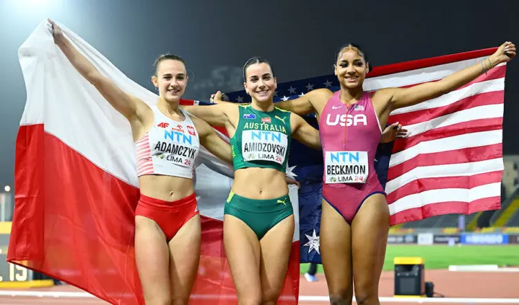 In the women's long jump Delta Amidzovski of Australia jumped a PB of 6.58m to take a surprise win. Close behind, Sophia Beckmon of the United States took silver with 6.54m, while Julia Adamczyk of Poland took bronze with 6.34m.