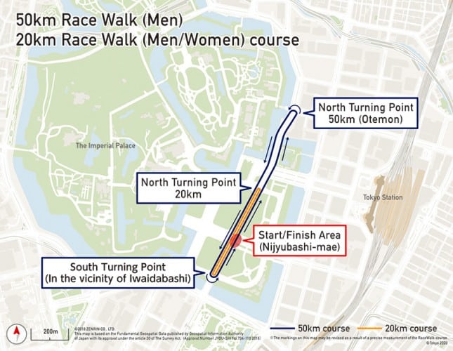 The race walk events will take place in the Imperial Palace Outer Gardens where there will be a 1km loop course for the 20km events and a 2km loop course for the 50km event.