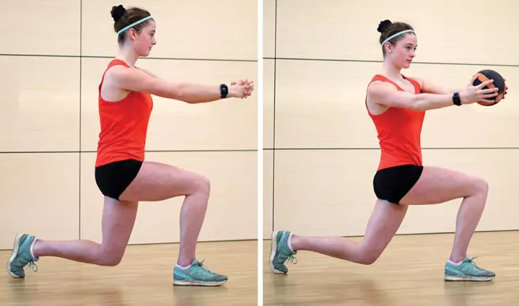Options: a side lunge can be added which has the benefit of engaging the adductors and abductors. Further advances can be made by holding a suitable weight medicine ball (start with 2kg) and by adding a twist left, right and back to centre from the torso once in the lunge position.