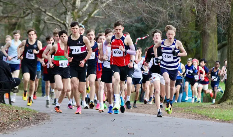 There were fireworks from the outset of the six-stage boys' race, with national champion Dover against the in-form Quinn Miell-Ingram. The course seemed fast, though not perfect, with a few steps of mud in the early woodland section and quite a stiff breeze, albeit behind the athletes for much of the perimeter. Course record conditions? Many seasoned spectators were doubtful.