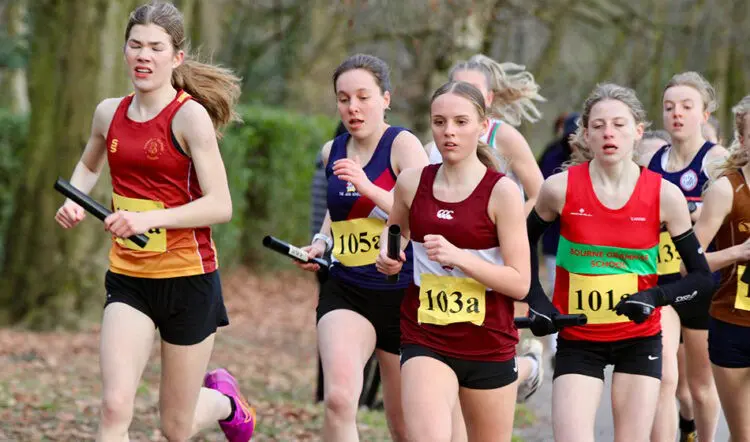 The concurrent girls event suffered the late withdrawals of the previous two winners – St Aidan’s and Bradford Grammar. So perennial podium placers Upton Hall must have fancied their chances and the Merseysiders were delighted when English Schools’ steeplechase champion Gabrielle Phelan came round to win the opening leg in 13:13. Yvette Anniss was the only other girl to remain in touch, mirroring her male team-mates in promoting the Bourne vest early on for a 13:23 clocking. Essex challengers New Hall closed in third albeit nearly half a minute in arrears.